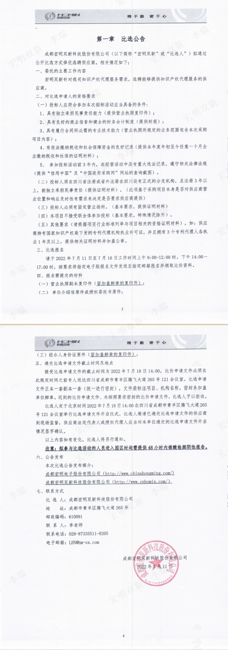 成都宏明双新科技股份有限公司专利代理机构选聘项目公开比选公告