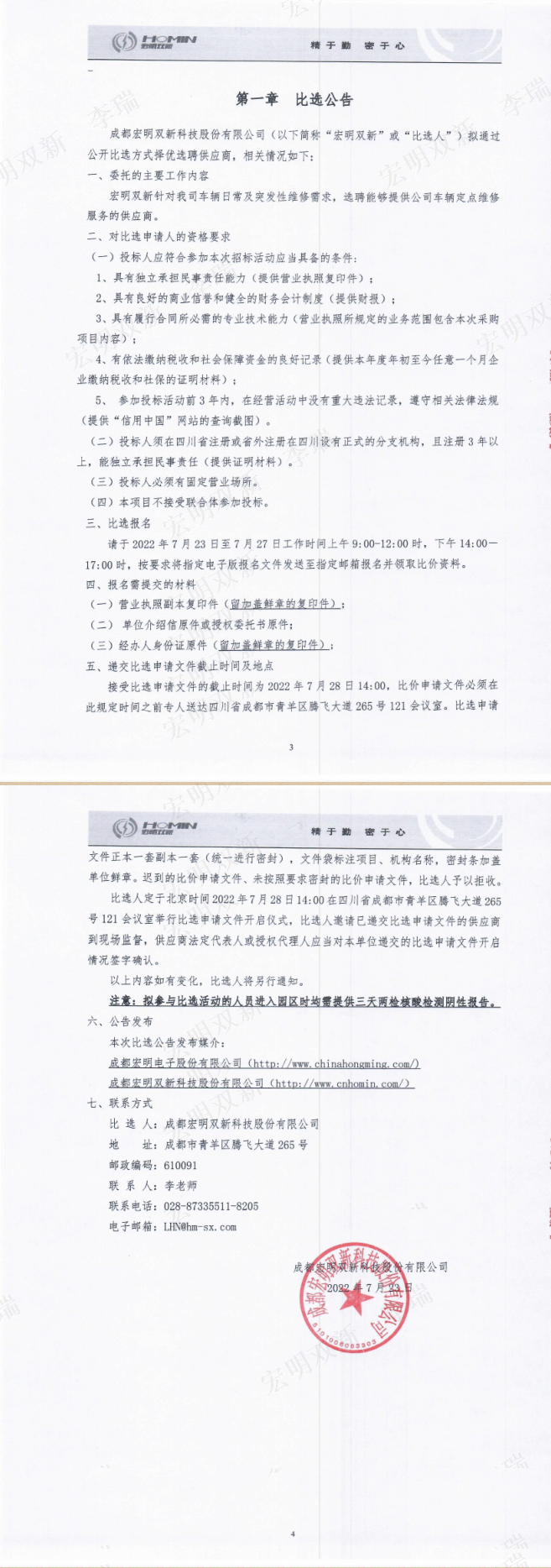 成都宏明双新科技股份有限公司广告印刷服务供应商采购活动公开比选公告