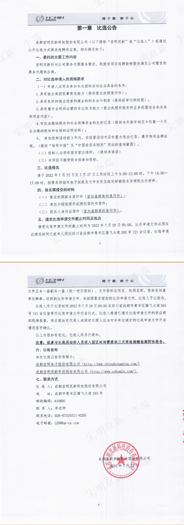 成都宏明双新科技股份有限公司票务代理服务采购项目公开比选公告