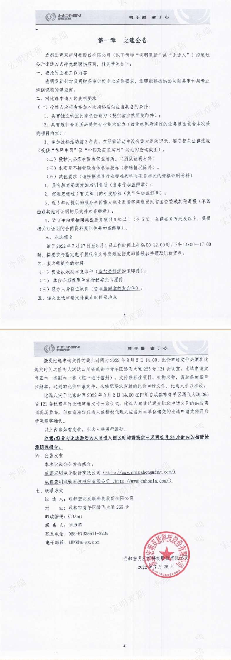 成都宏明双新科技股份有限公司财务审计类专业课程培训会员卡办理项目公开比选公告