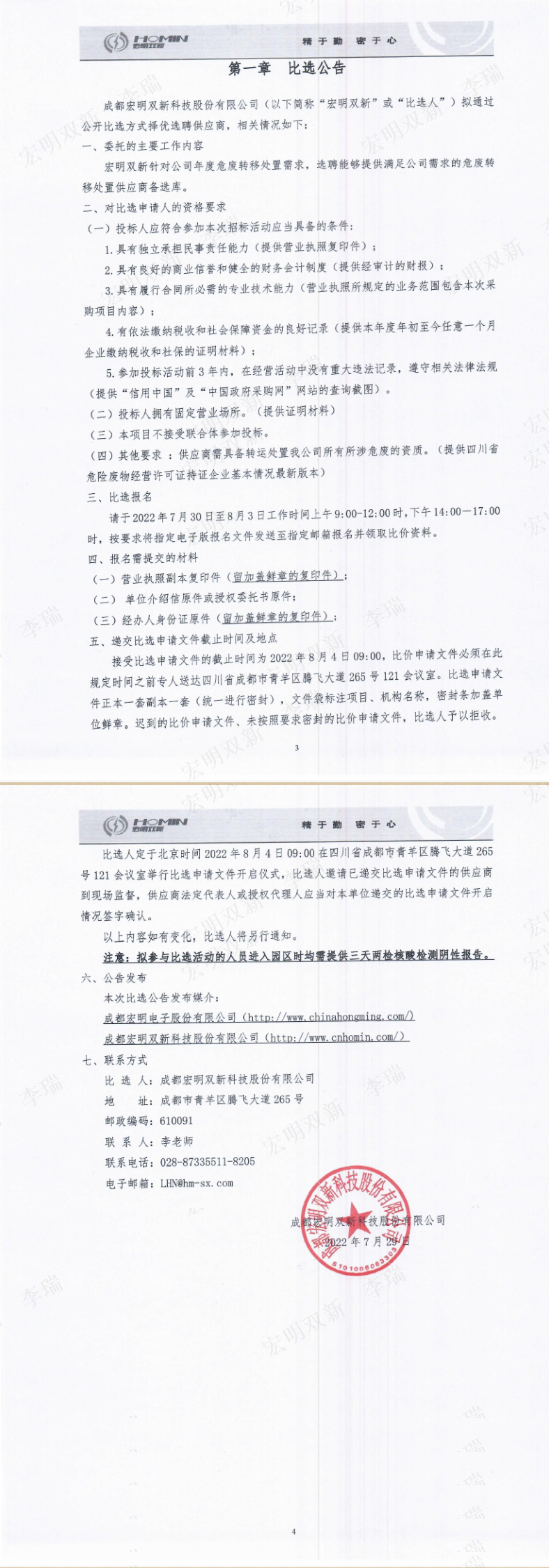 成都宏明双新科技股份有限公司 2022-2023年度危废转移处置供应商备选库选聘项目公开比选公告