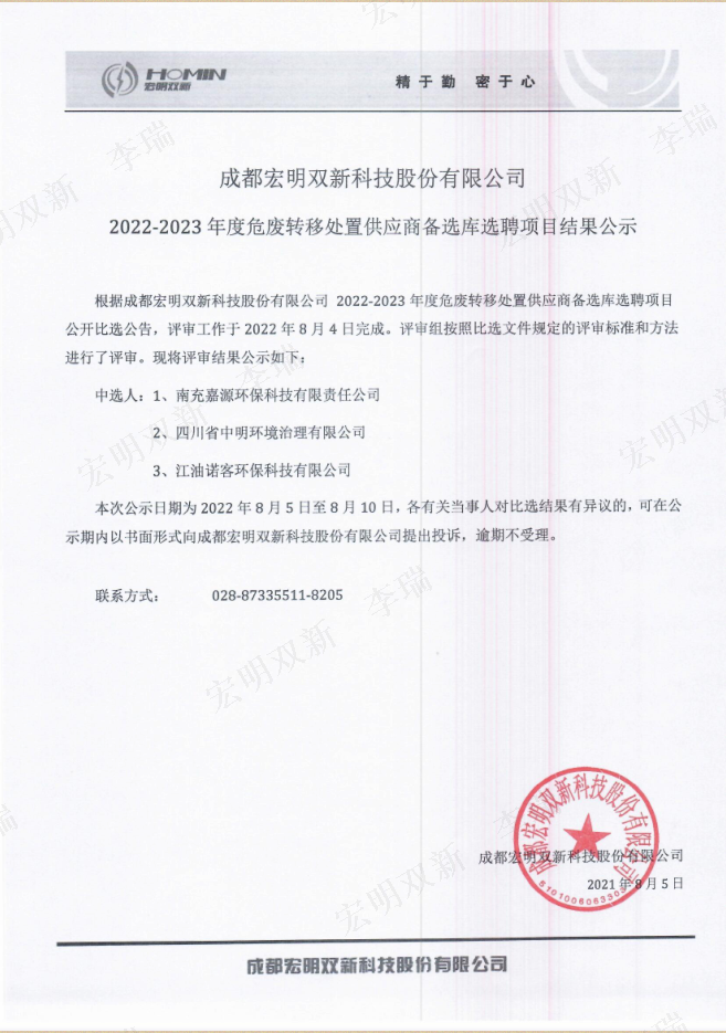成都宏明双新科技股份有限公司2022-2023年度危废转移处置供应商备选库选聘项目结果公示