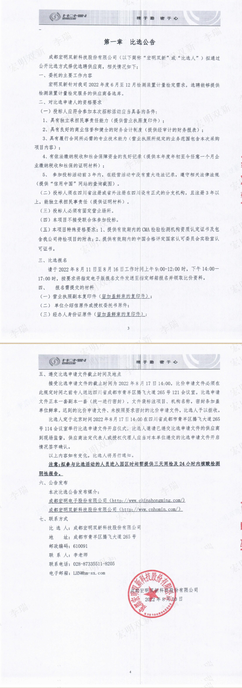 成都宏明双新科技股份有限公司检测装置计量检定供应商备选库选聘项目公开比选公告
