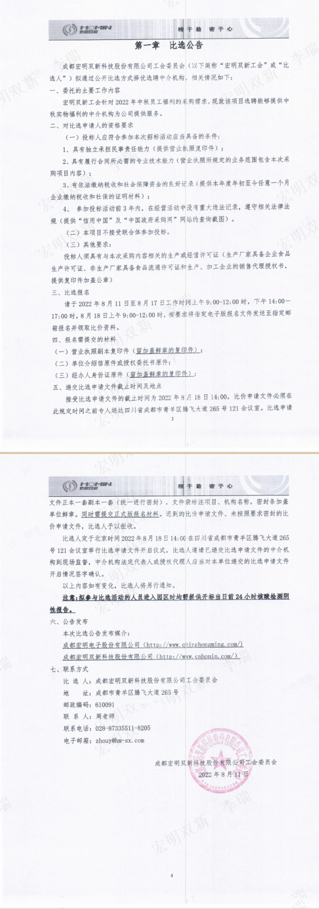 成都宏明双新科技股份有限公司工会委员会2022年中秋员工福利供应商选聘公开比选公告