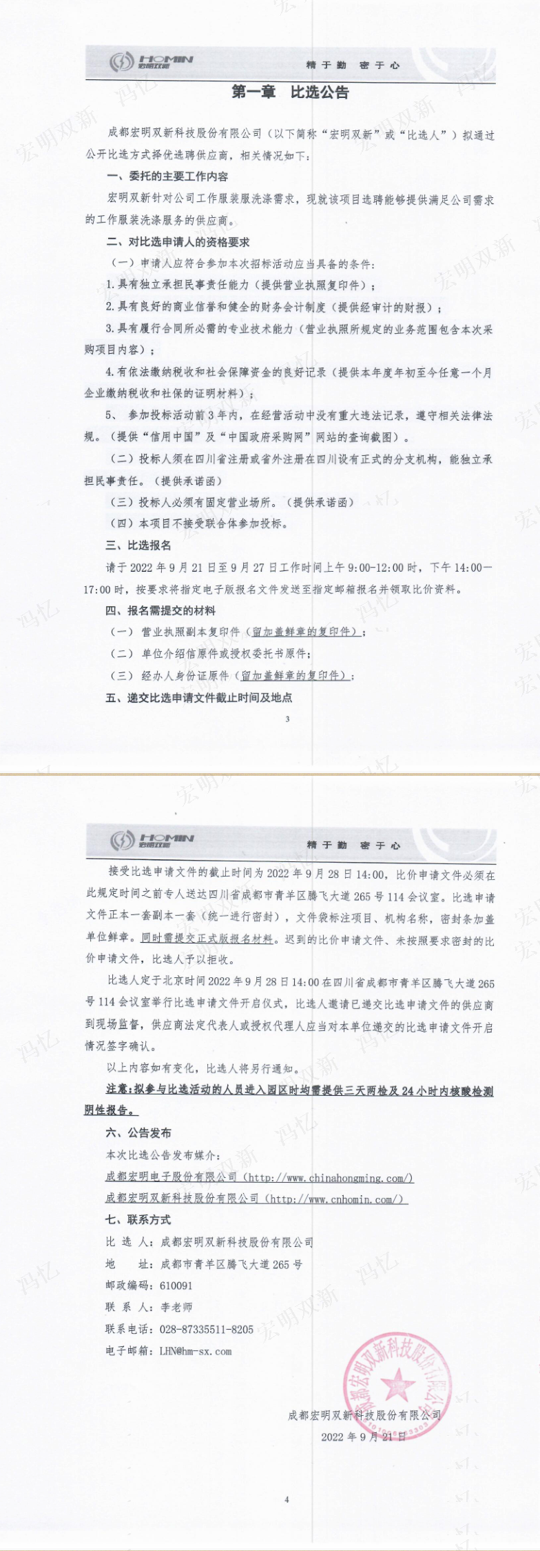 成都宏明双新科技股份有限公司工作服装洗涤供应商采购项目公开比选公告