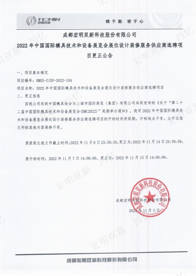 成都宏明双新科技股份有限公司2022年中国国际模具技术和设备展览会展位设计装修服务供应商选聘项目更正公告