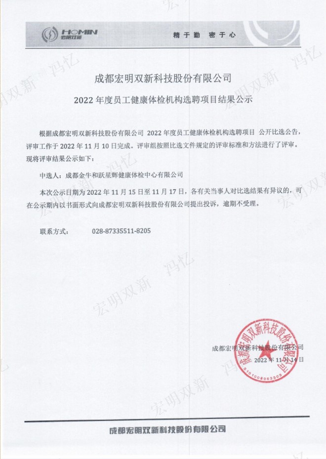 成都宏明双新科技股份有限公司2022年度员工健康体检机构选聘项目结果公示