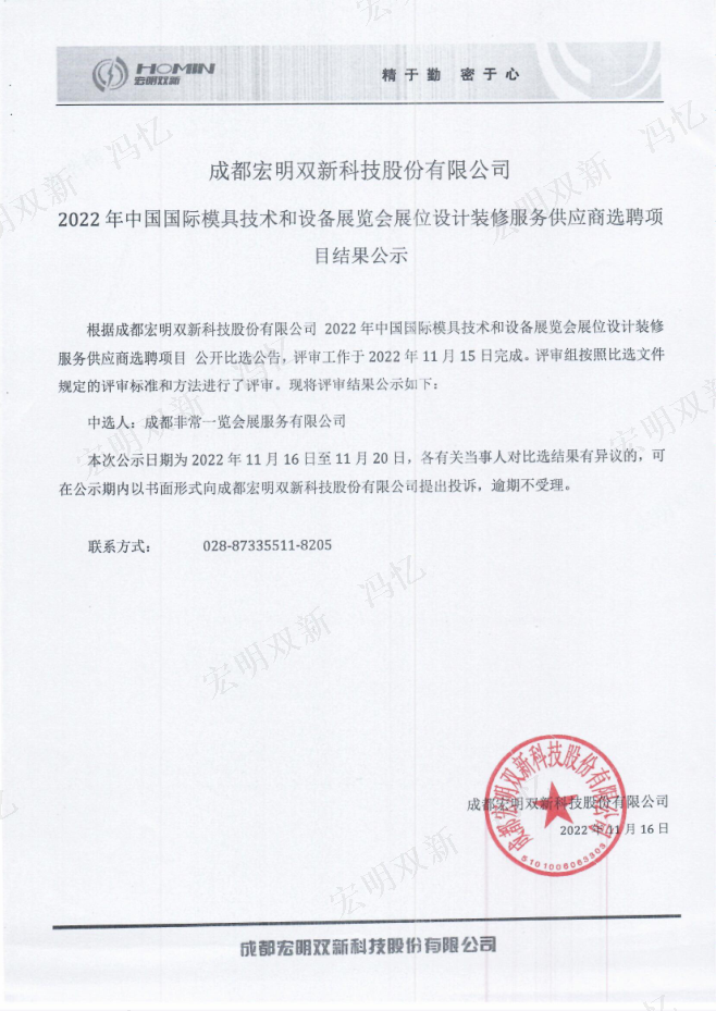成都宏明双新科技股份有限公司2022年中国国际模具技术和设备展览会展位设计装修服务供应商选聘项目结果公示