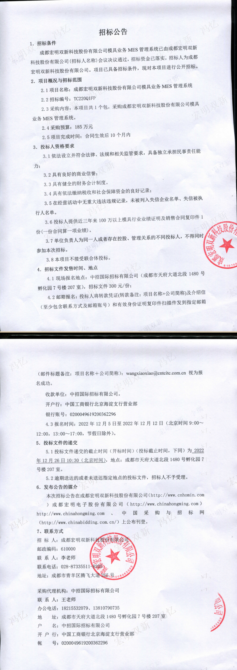成都宏明双新科技股份有限公司模具业务MES管理系统招标公告