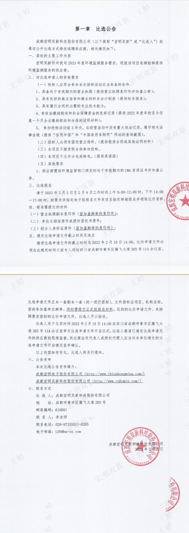 成都宏明双新科技股份有限公司 2023年度环境监测供应商选聘项目 公开比选项目申请挂网公示