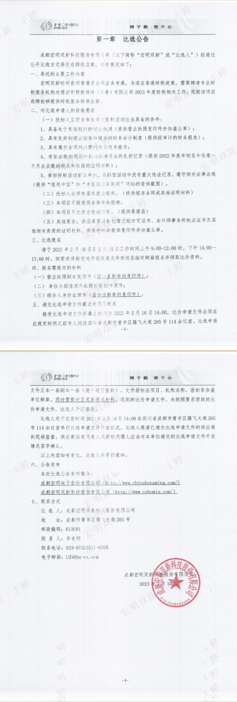 成都宏明双新科技股份有限公司 双新香港公司财税服务供应商选聘项目 公开比选公告