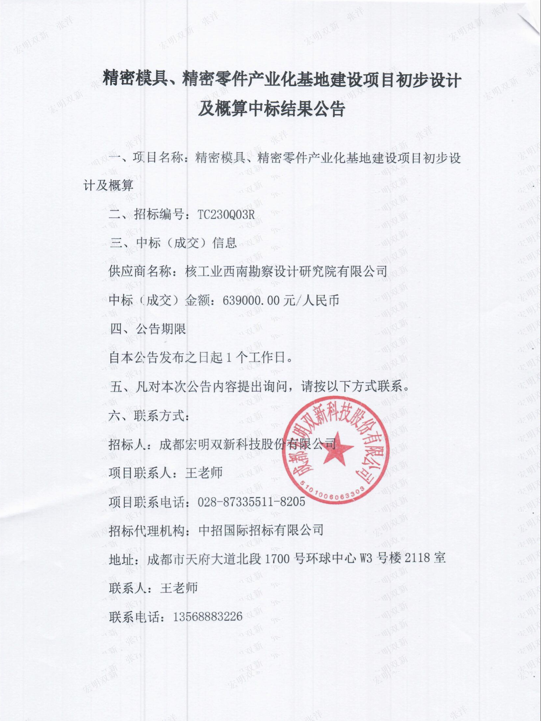 精密模具、精密零件产业化基地建设项目初步设计及概算中标结果公告