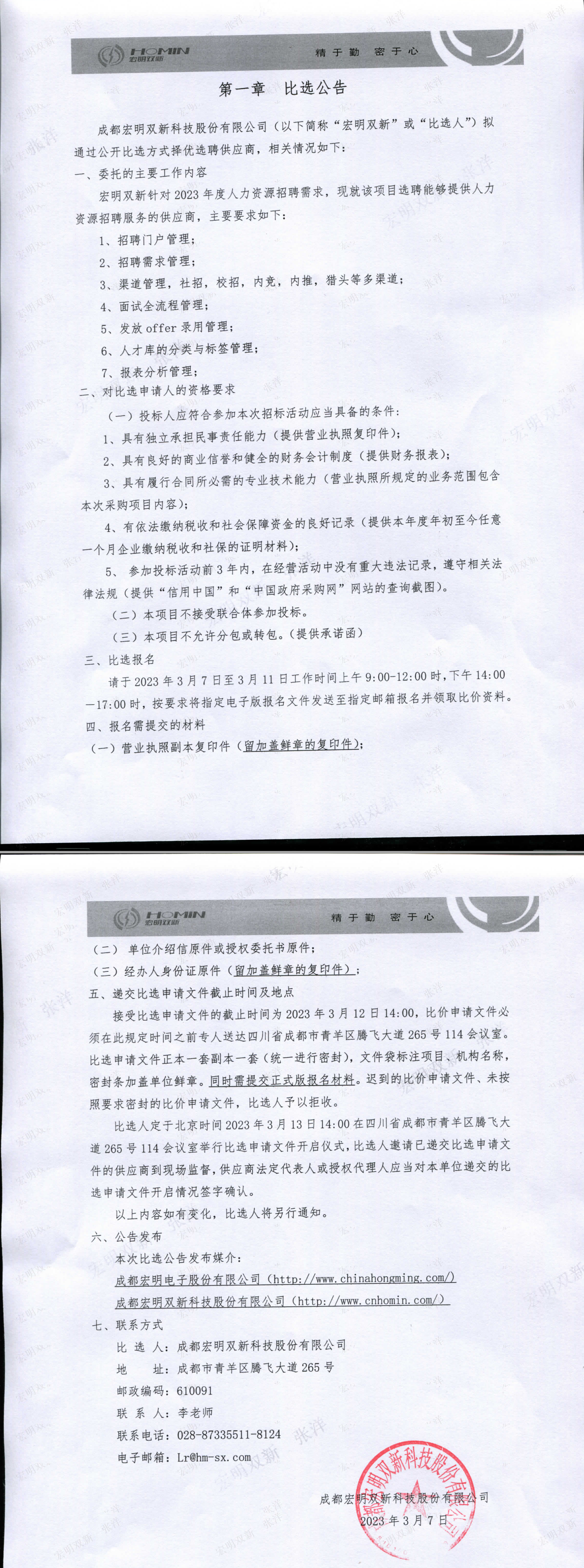 成都宏明双新科技股份有限公司2023年度招聘系统选聘项目公开比选公告