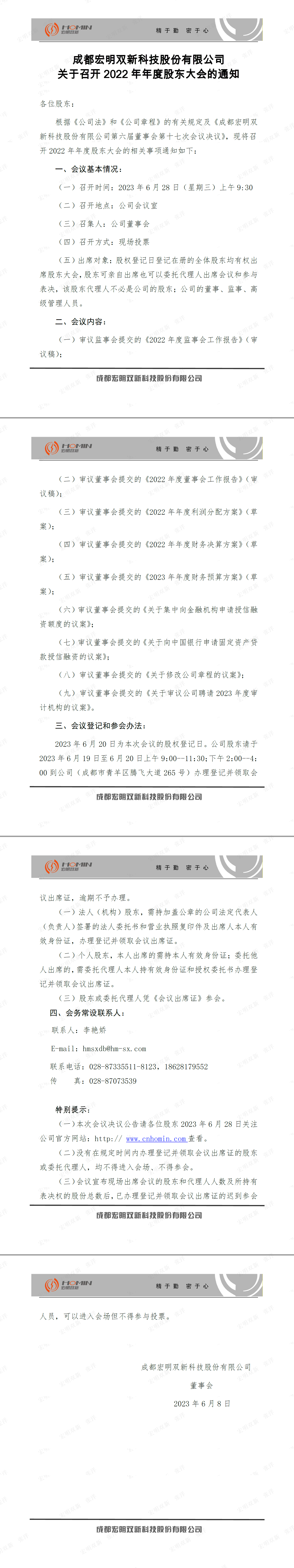 成都宏明双新科技股份有限公司 关于召开2022年年度股东大会的通知